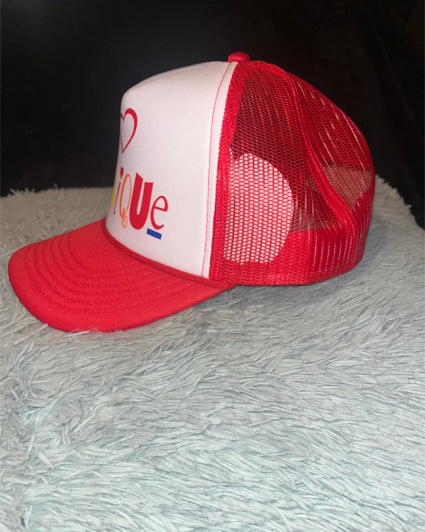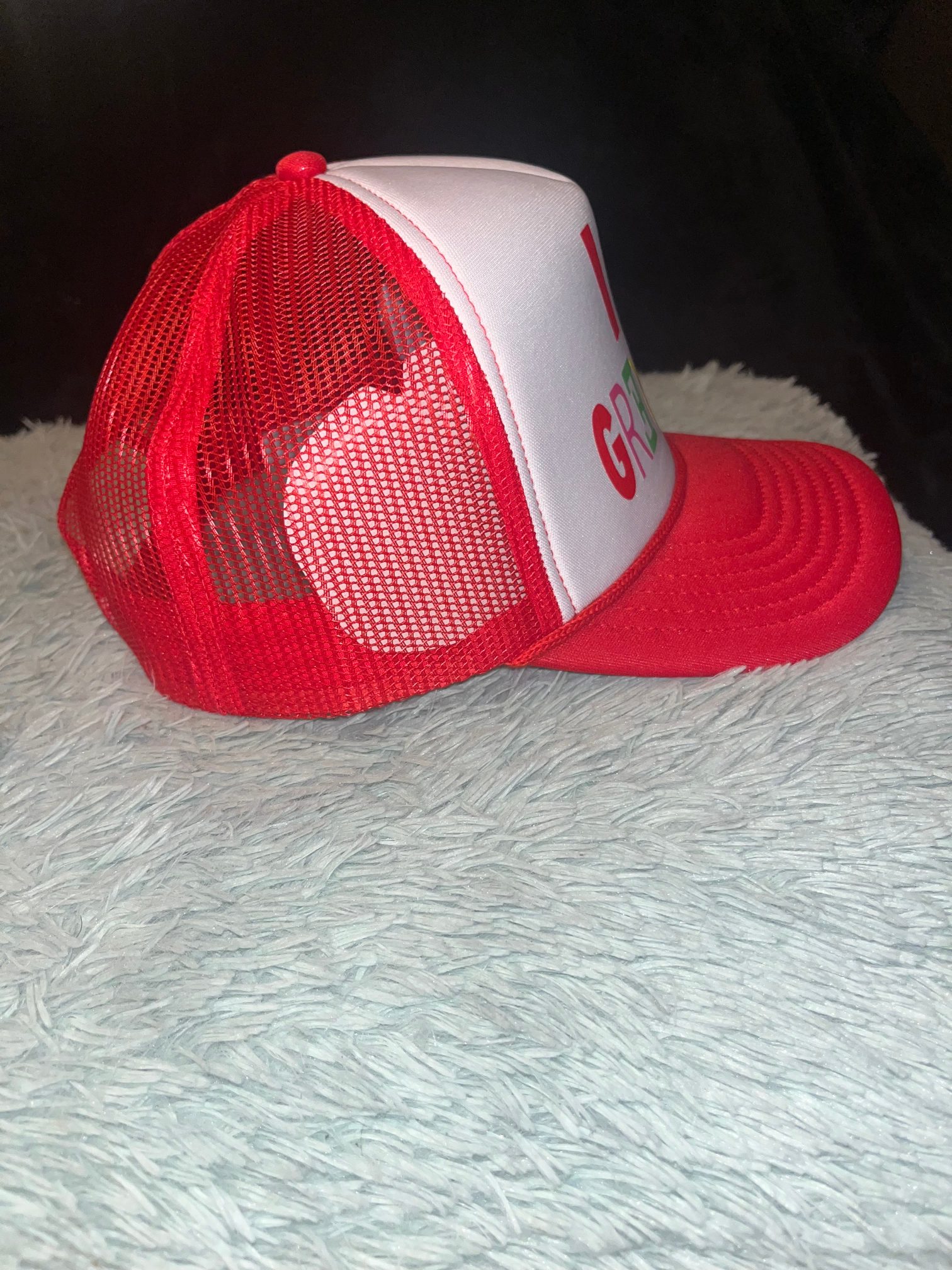 100% polyester trucker’s hat from Grenique’s When Butterflies Become Unicorns era. 21.7 to 22.8 inches. 4.7in-2.75in adjustable snap.